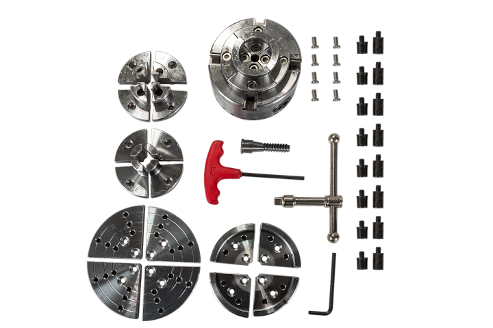 Токарный патрон, диаметр 95 мм, присоединительная резьба M33х3.5, комплект сменных кулачков, зажимной ключ под квадрат, делительное приспособление на патроне, винтовая вставка, ключ шестигранный, кейс.